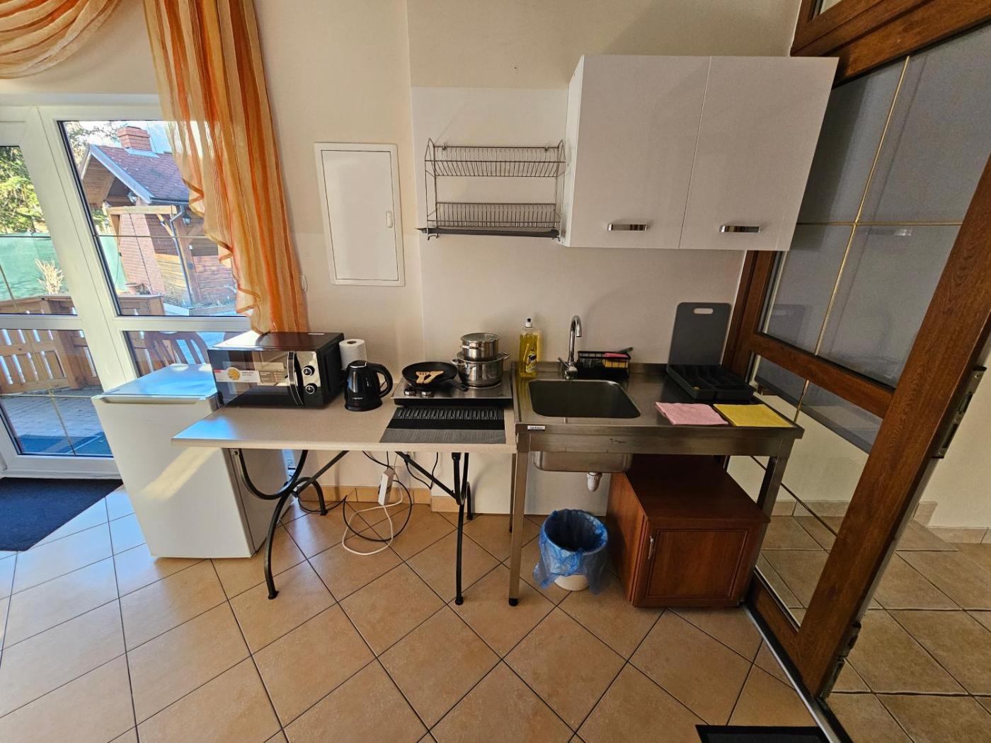 Mały pokój Dwuosobowy. The double room features a carpeted floor and heating, as well as a private bathroom featuring a shower. Guests will find a refrigerator, kitchenware, a microwave and a toaster in the well-fitted kitchenette. The double room also provides guests with a barbecue. The double room provides a flat-screen TV, a tea and coffee maker, executive lounge access, a wardrobe as well as garden views. The unit offers 1 bed. Pokój Dwuosobowy - 1 osobowy. Powierzchnia pokoju ok.: 15 mkw. ;